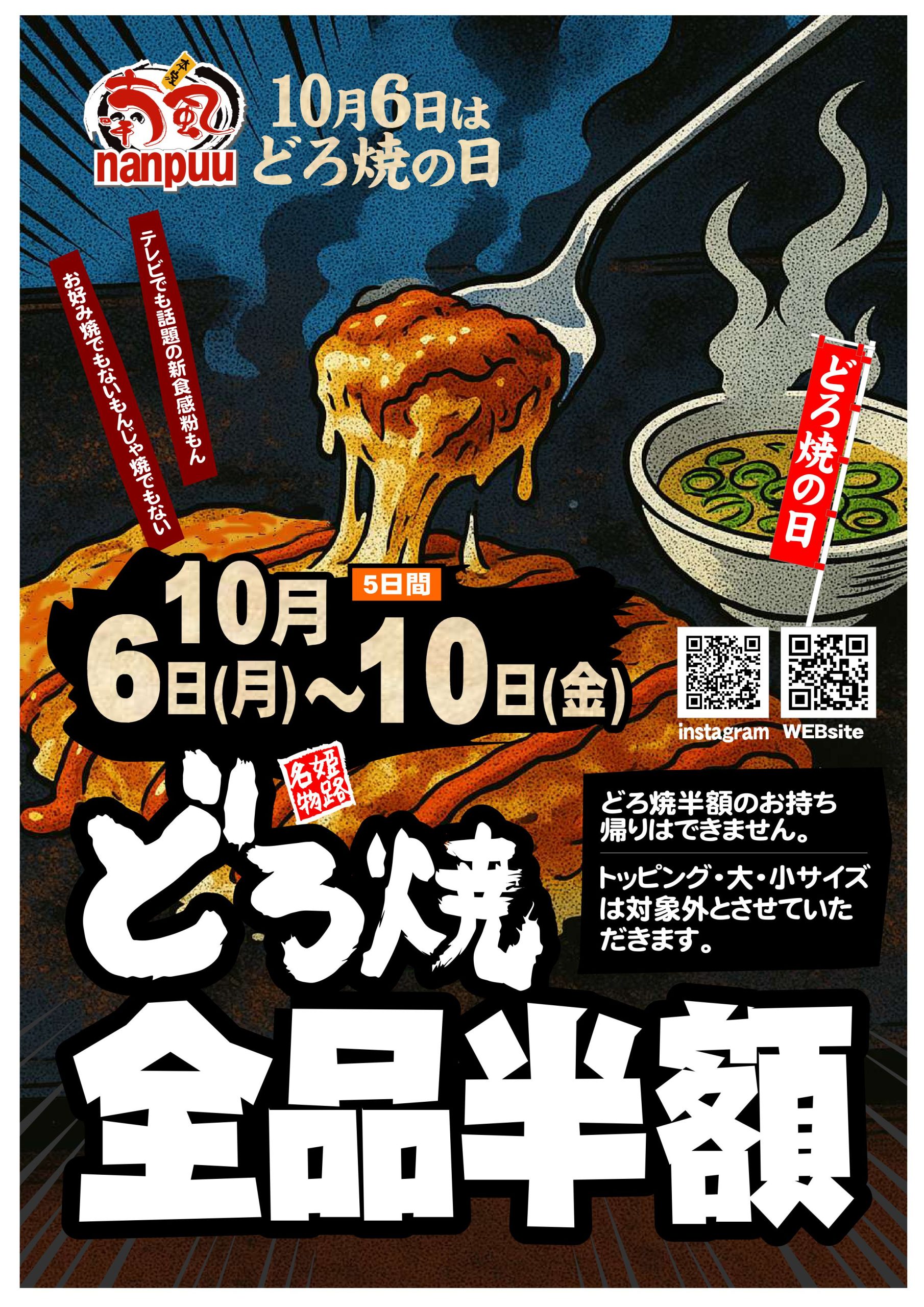 恒例となりました「10月6日はどろ焼の日」 10月6日(月)~10日(金)の5日間、どろ焼全品半額まつりを開催いたします。