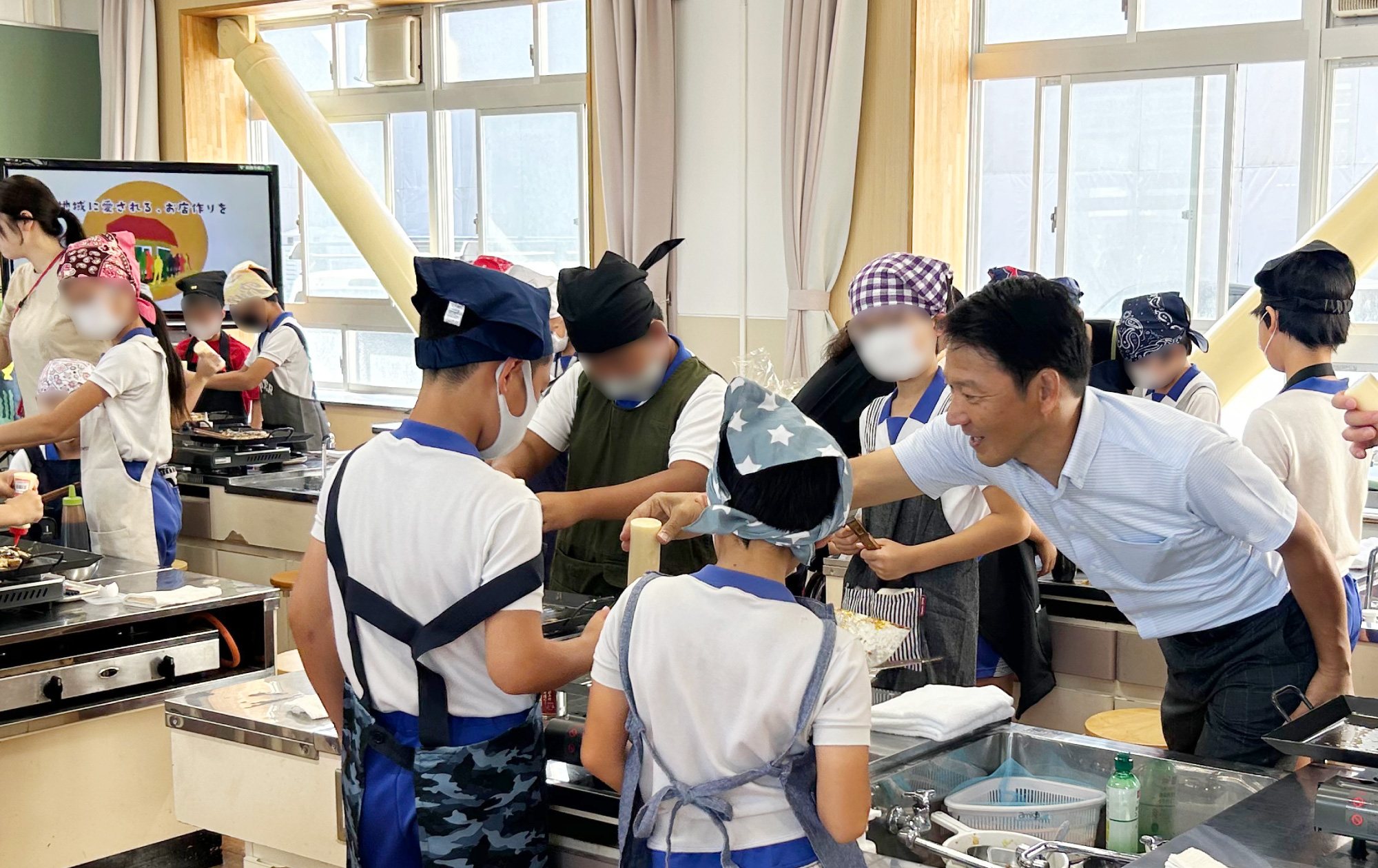 喃風では名物「どろ焼き」をはじめ、丸くないたこ焼きや播州モダンなどの個性豊かなメニューを揃えている中から、2025年度は姫路名物の「すじこん」を使ったお好み焼きを子どもたちに1から作ってもらいました。